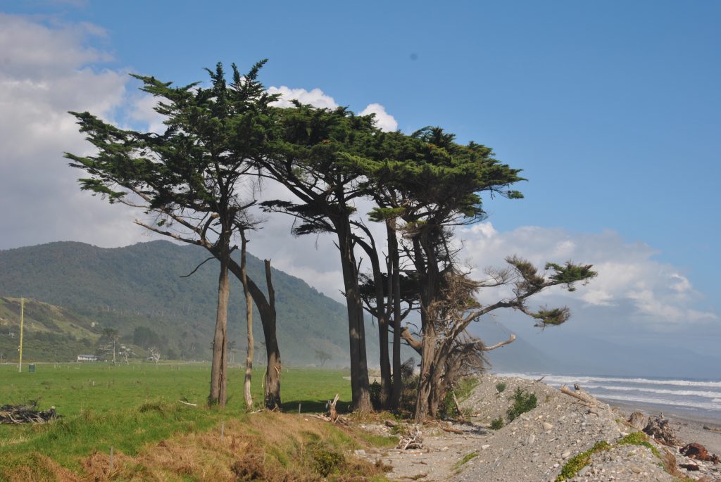 Intussen was het heerlijk warm geworden, zo’n 23 graden en we zijn toen toch nog maar even richting zee gereden om op het strand te gaan zitten. Er is hier altijd wel wind aan het stand, dat kun je ook zien aan de bomen.