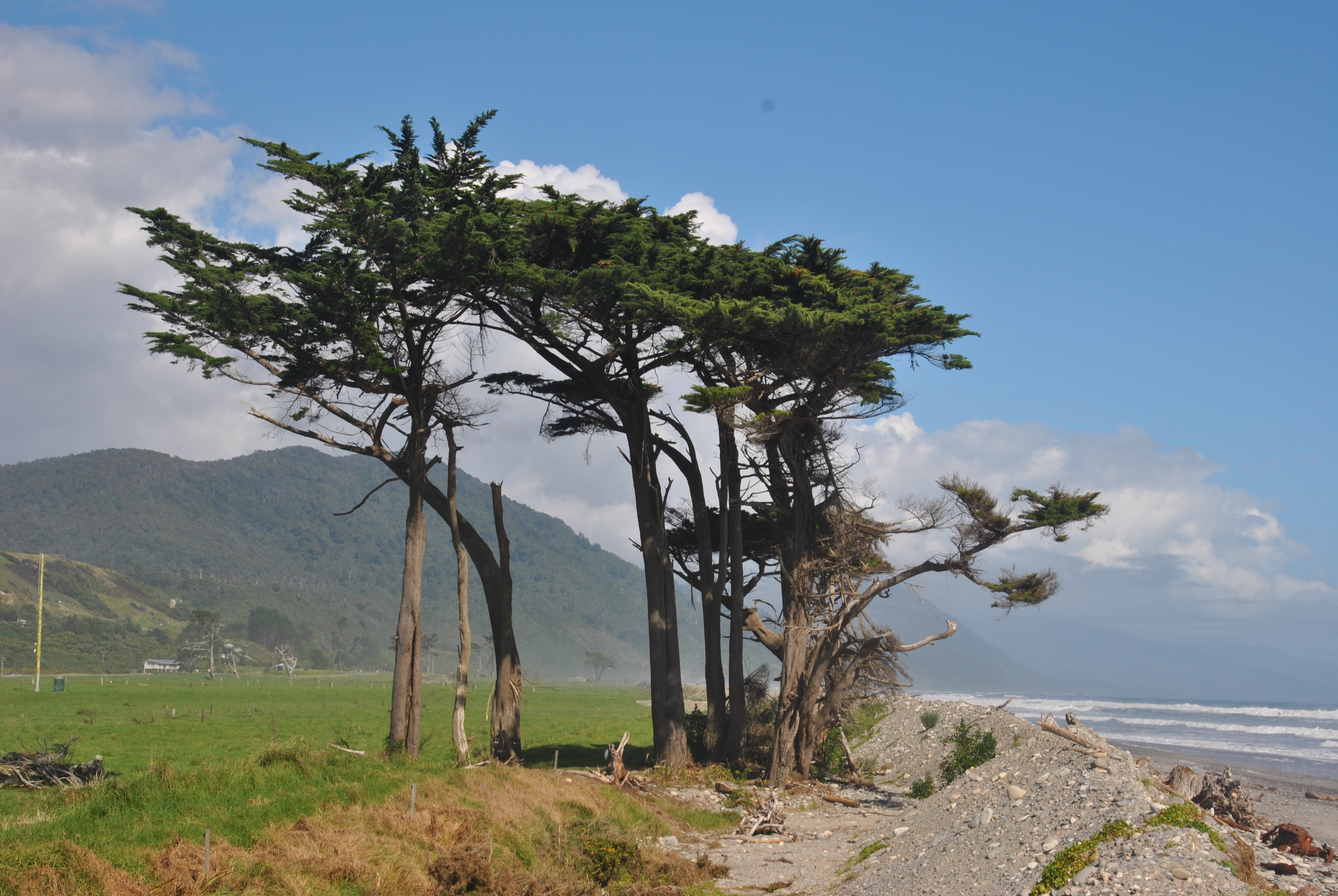 Intussen was het heerlijk warm geworden, zo’n 23 graden en we zijn toen toch nog maar even richting zee gereden om op het strand te gaan zitten. Er is hier altijd wel wind aan het stand, dat kun je ook zien aan de bomen.