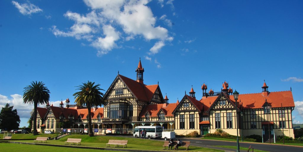 Het museum van Rotorua, een prachtig gebouw, is al sinds de aardbeving van november 2016 gesloten wegens schade aan de fundering.